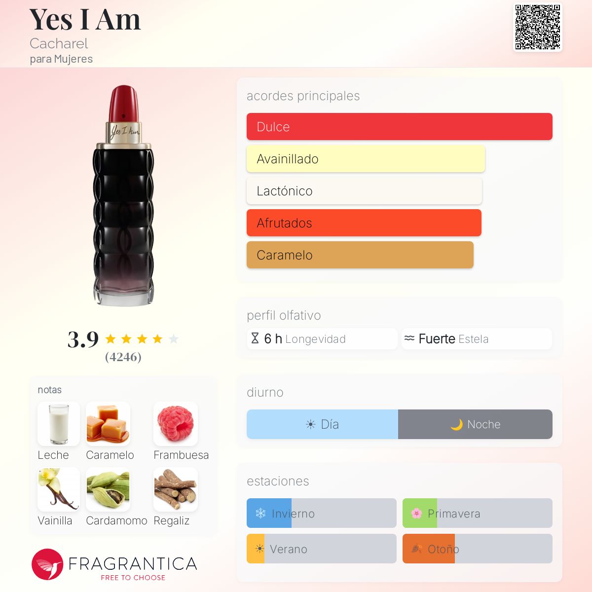 Yes I Am de Cacharel es una fragancia de la familia olfativa Oriental Floral para Mujeres. Yes I Am se lanzó en 2018. Yes I Am fue creada por Honorine Blanc y Christophe Raynaud. Las Notas de Salida son frambuesa, mandarina, bergamota y limón (lima ácida); las Notas de Corazón son gardenia, flor de jengibre, ámbar, jazmín, flor de azahar del naranjo y rosa; las Notas de Fondo son leche, caramelo, vainilla, cardamomo, regaliz, cumarina, benjuí, sándalo y Amberwood.